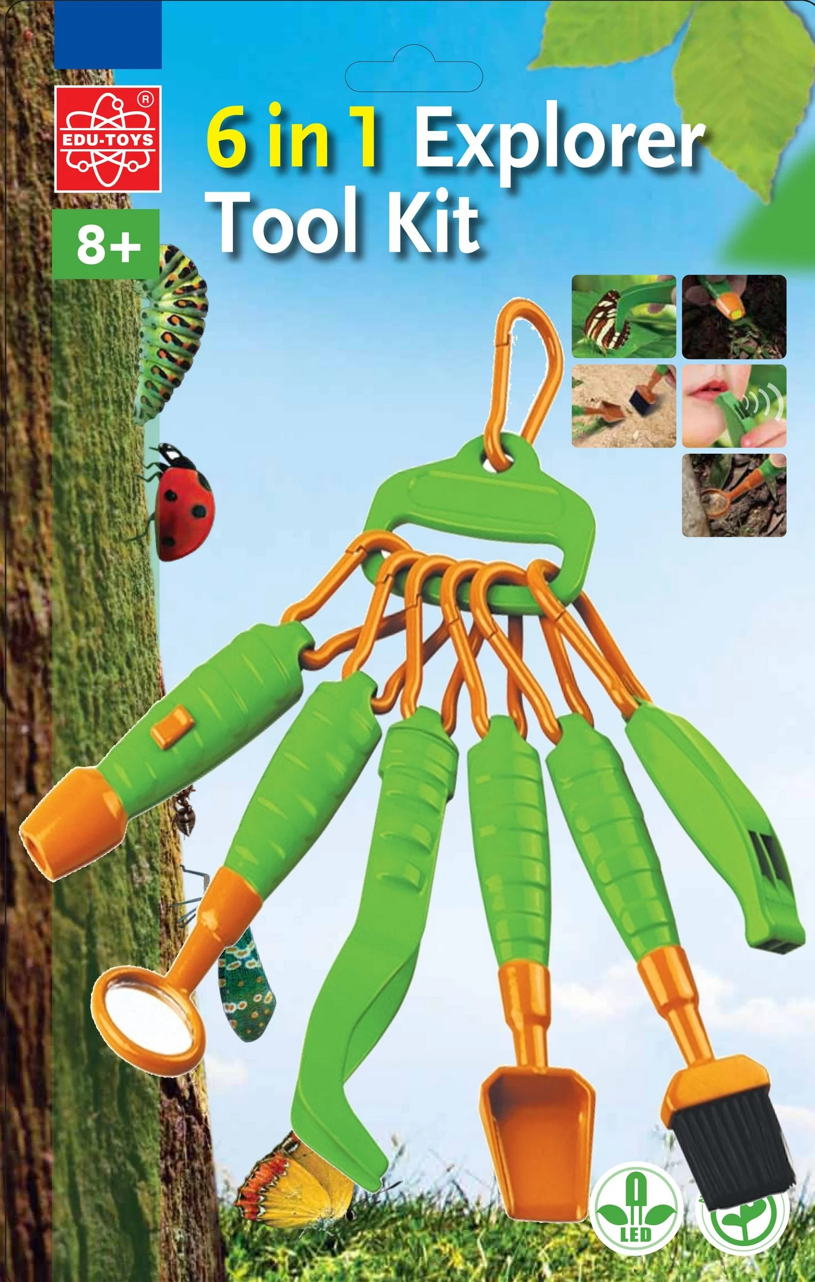 Das 6-in-1 Naturforscher-Werkzeug von Edu-Toys ist das ideale Outdoor-Tool für kleine Entdecker. Dank seines Karabinerhakens lässt es sich mühelos am Rucksack, Gürtel oder einer Tasche befestigen und ist damit jederzeit griffbereit. Mit Pfeife, Pinzette, LED-Lampe, Schaufel, Insektenbürste und Signalspiegel unterstützt es Kinder beim Erkunden der Natur – von Insektenbeobachtungen bis hin zu kleinen Outdoor-Abenteuern.