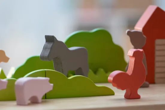 Mit dem vielseitigen Bausteinset „Bauernhof“ entsteht ein eigener Hof zum Spielen – mit Tieren, Wiesen, Hecken und einem kleinen Holzhaus. Kinder gestalten immer wieder neue Szenen mit Kuh, Schwein und Esel, ordnen Stall, Weide und Garten nach Lust und Laune und tauchen in lebendige Rollenspiele ein. Die griffigen Holzteile fördern Feinmotorik und Konzentration, während alltägliche Hofsituationen zum Erzählen, Benennen und Geschichtenerfinden anregen.