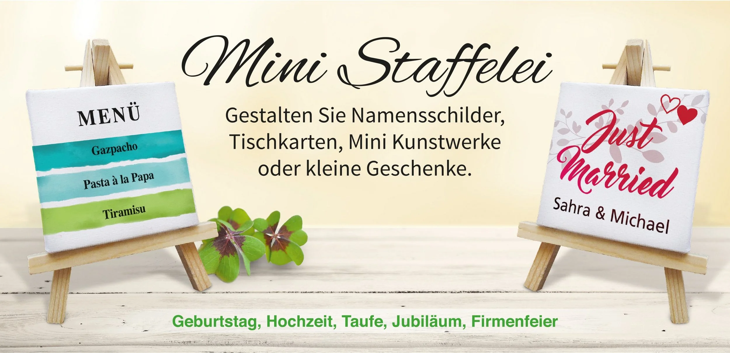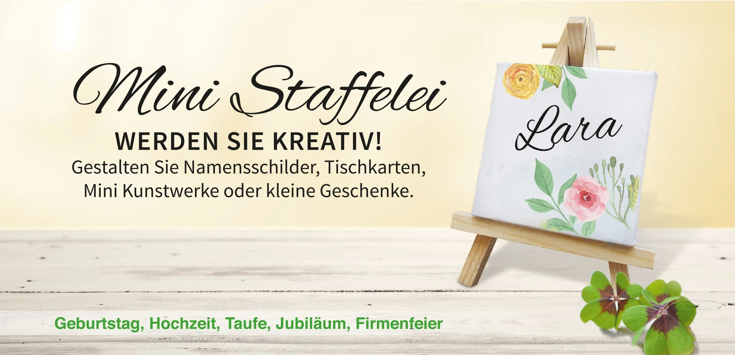 Die naturbelassene Holzstaffelei und die kleine Leinwand (7 × 7 cm) können nach Belieben beschriftet, bemalt oder mit verschiedensten Dekotechniken verziert werden – von Acryl- und Ölfarben über Serviettentechnik bis hin zu Glitzer, Perlen oder Stickern.