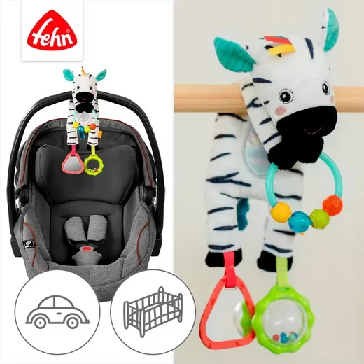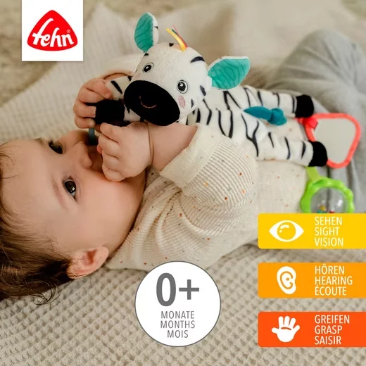 Dank der praktischen Form kann das Zebra einfach über Kinderwagen, Babyschale, Spielbogen, Wiege oder Bett gehängt werden. Ballrassel, Quietsche, Raschelpapier, Perlenring und Spiegel sorgen für abwechslungsreiche Effekte, wecken Neugier und unterstützen die Entwicklung der motorischen Fähigkeiten und der Selbstwahrnehmung.
