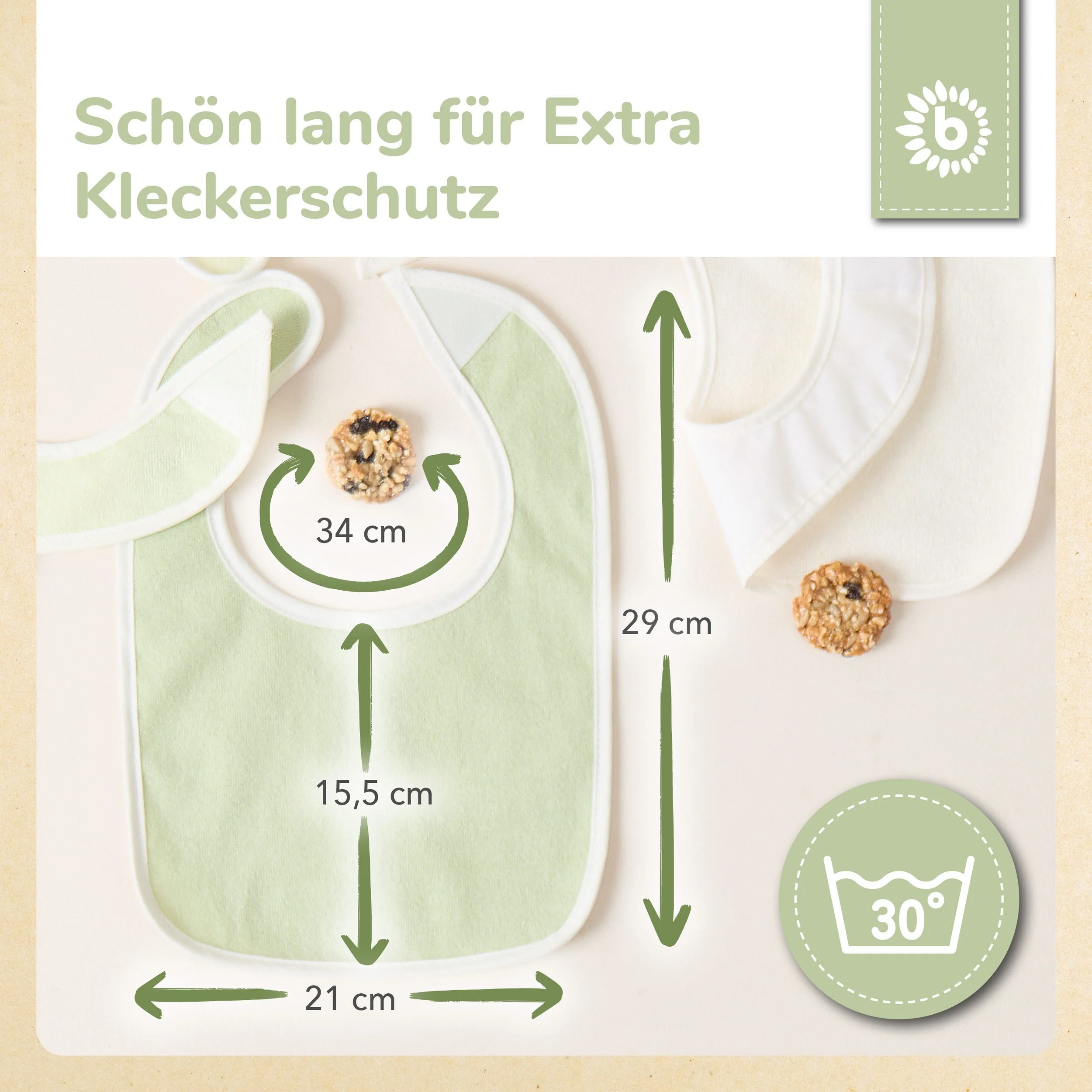Die zeitlosen Farben des Lime-Mix-Sets machen die Lätzchen zu einem schönen Hingucker. Mit praktischem Klettverschluss ausgestattet, lassen sie sich schnell und bequem anlegen. Perfekt als Geschenk zur Babyshower oder als Teil der Erstausstattung geeignet.