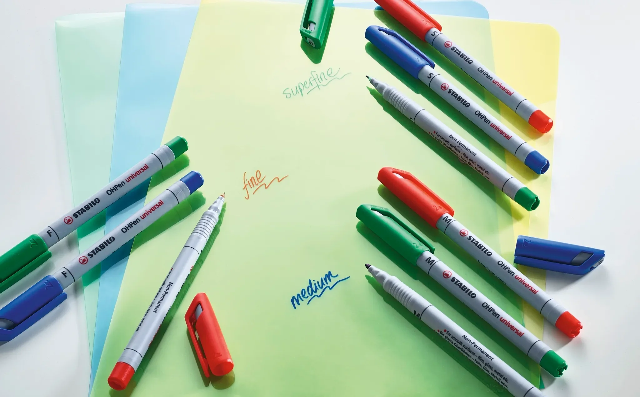 Der STABILO OHPen universal ist ein vielseitiger Folienstift zum Schreiben auf nahezu allen glatten Oberflächen – z. B. Glas, Metall, Kunststoffen, Etiketten, Fotos oder Overhead-Folien. Die wasserlösliche, geruchsarme Tinte bietet eine brillante Farbwiedergabe und lässt sich leicht wieder entfernen.